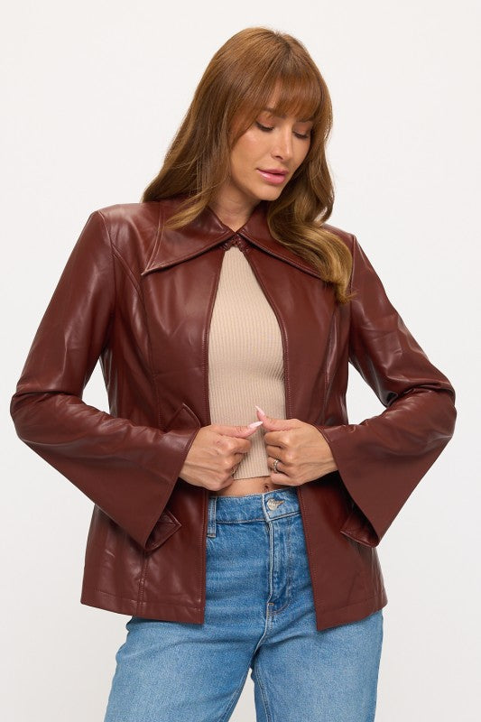 A stunning blend of vintage romance and modern refinement, the Bohemian Baroness Vegan Jacket exudes effortless sophistication with a touch of free-spirited charm. Crafted from supple vegan leather, it features a unique maroon color, a dramatic pointed collar and a sleek open-front design that make a bold, timeless statement. The tailored fit flatters your figure, while the graceful length and flared sleeves add an air of understated elegance. Luxurious in feel yet consciously crafted, this piece perfectly balances artistry and edge — a true showstopper for the modern bohemian.
