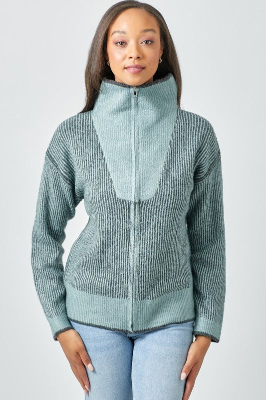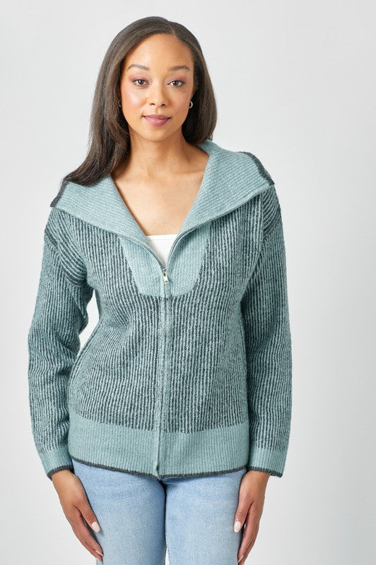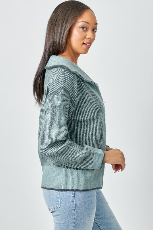 The Fireside Zip Sweater is made for cozy moments and easy everyday wear. Designed with a soft stripe ribbed knit, this zip-up sweater offers warmth without feeling heavy. The front zipper and high collar create a snug, comfortable fit that feels perfect for cool mornings, relaxed weekends, or curling up by the fire. Finished in a calming blue mix, it pairs effortlessly with denim for a look that feels both comfortable and pulled together.