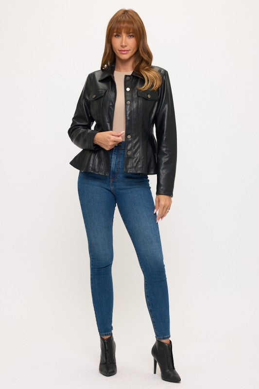 Confident, feminine, and undeniably chic — the Maverick Belle Jacket makes a statement wherever you go. Crafted from supple vegan leather, it features a tailored shirt-style silhouette with a button-front closure and a structured collar that frames the neckline beautifully. Thoughtful seaming and a subtle peplum hem create a flattering hourglass shape, blending timeless sophistication with a touch of modern edge. Finished with dual chest pockets for a hint of classic utility, Maverick Belle embodies the perfect balance of boldness and grace.