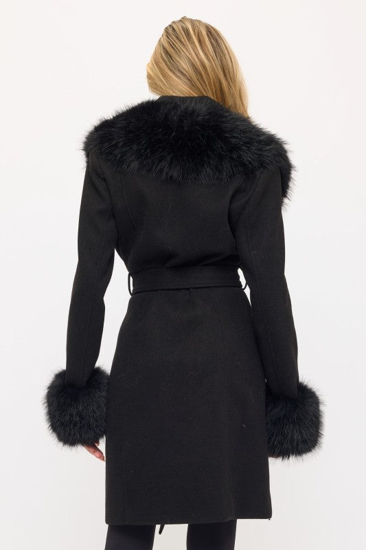 The Midnight Luxe Coat brings drama, warmth, and timeless polish to your cold-weather wardrobe. Designed in a rich black vegan wool, this midi-length beauty features plush faux fur accents at the collar and cuffs, both fully removable, so you can switch from statement-making glamour to sleek minimalism in an instant.