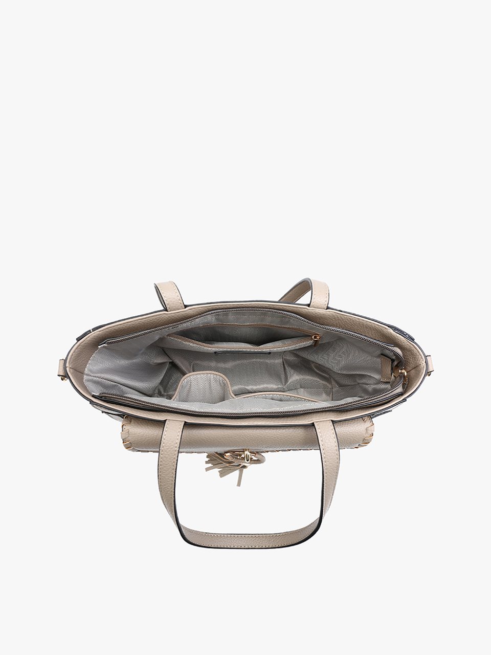 The Phoebe Whipstitch Tote blends timeless sophistication with everyday practicality. Thoughtful whipstitch detailing and chic decorative accents elevate its classic silhouette, while multiple pockets keep essentials effortlessly organized. A removable crossbody strap adds versatility, allowing you to carry it by the handles or go hands-free when your day gets busy. Stylish, functional, and endlessly wearable — Phoebe is the perfect companion for workdays, weekends, and everything in between.