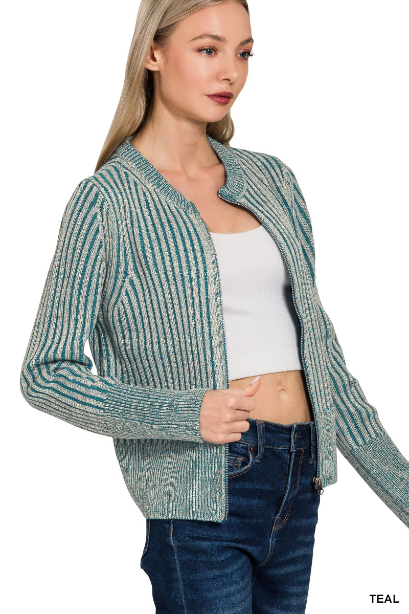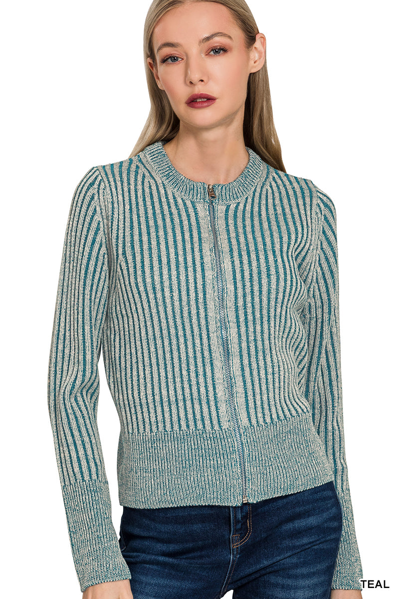 Elevate your casual layers with The Textured Layers Zip-Up — a cozy-chic cardigan that brings texture and tone to your fall wardrobe. With its rich two-tone ribbed knit and clean zip-front design, this piece offers both warmth and versatility. Whether paired with denim for weekend errands or layered over a tank for transitional days, it's the perfect mix of laid-back and pulled together.