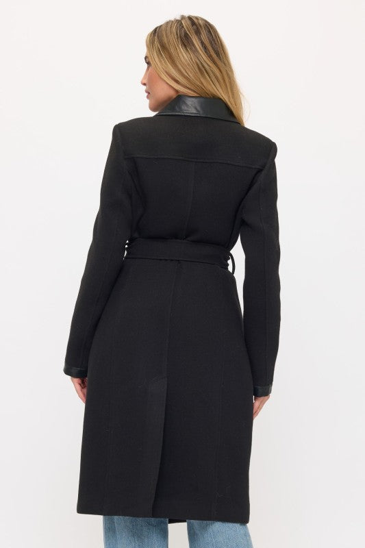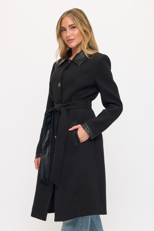 The Windsor Contrast Maxi Coat is where timeless elegance meets modern edge. Crafted from soft, premium vegan wool, this longline coat offers warmth, comfort, and beautifully structured shaping. Sleek faux leather accents along the collar, cuffs, pockets, and belt bring a contemporary contrast that elevates the entire silhouette.